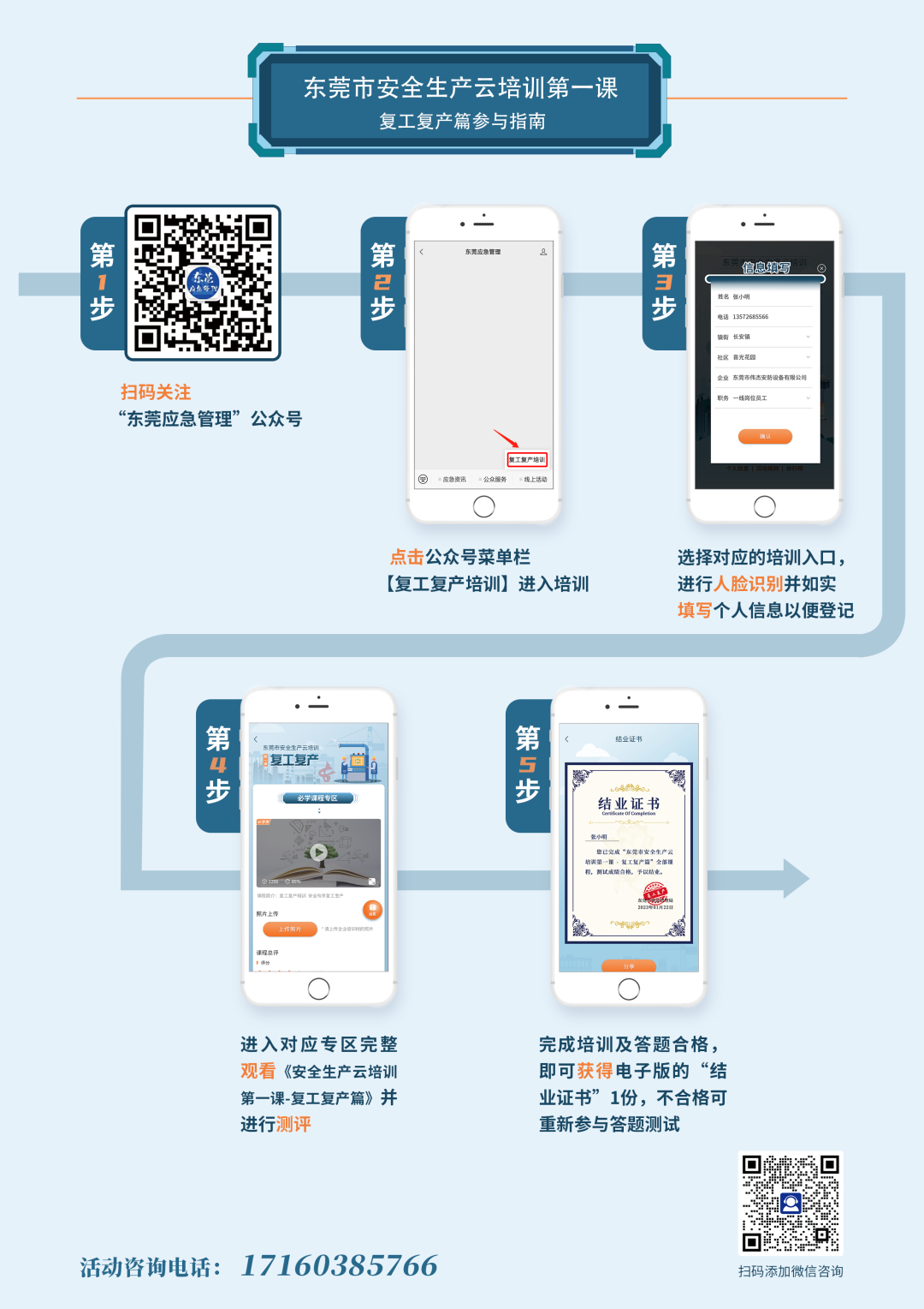 參與指南:關注“東莞應急管理”公眾號,通過點擊公眾號菜單欄【線上活動→復工復產培訓】,登記個人信息,完成注冊后,點擊“我要參加”進入培訓內容界面,點擊觀看視頻進行學習。