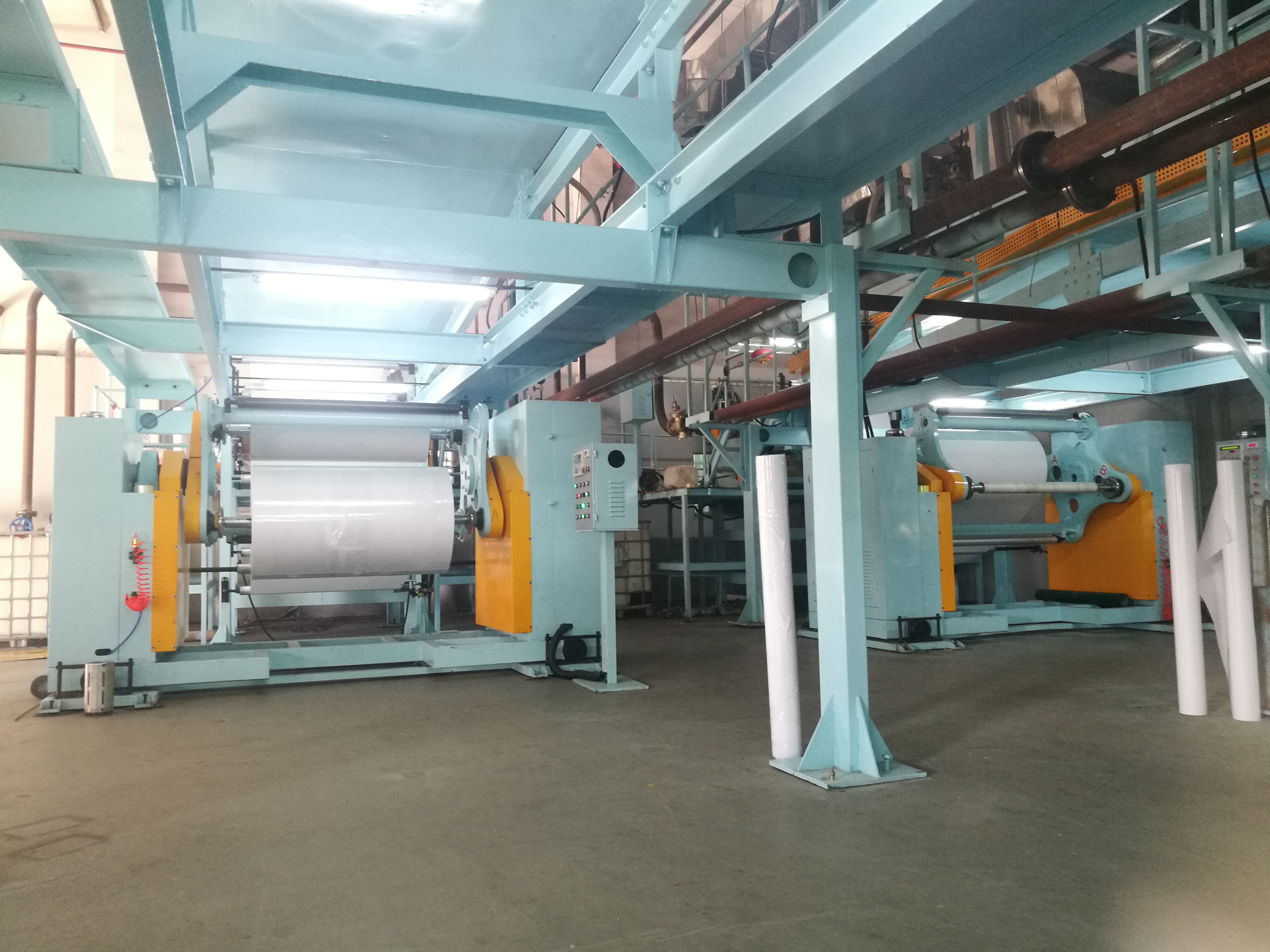 雙面涂布機采用矢量變頻無級調速大滾筒、牽引輥與網紋輥同步調速;網紋輥帶刮刀涂布方式,備有多種涂布量的網紋輥供選擇;移動式刮刀裝置;采用分段獨立恒溫半導體不銹鋼發熱管導熱油交換器加熱風干燥系統,可調式內循環吸排氣裝置;烘箱內導輥同主軸同步轉動,開門式烘箱及穿膜操作平臺;網紋輥、牽引壓輥由氣動電磁閥控制;自動計米裝置;收放卷軸采用鍵子式氣脹軸裝置,裝卸料操作方便;整機采用PLC電腦系統自動控制張力。